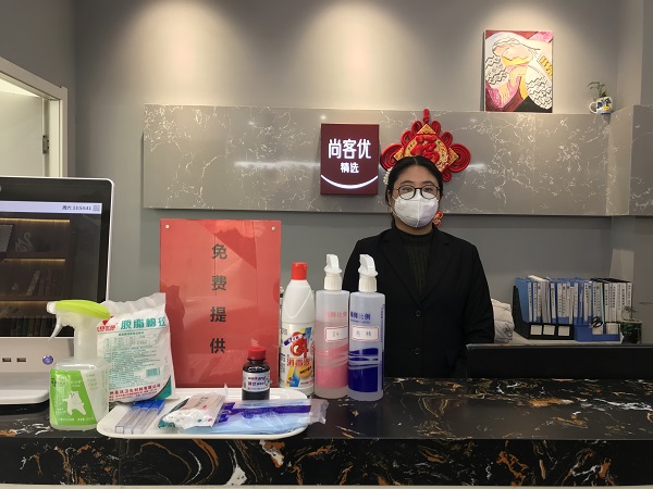 为了保证每位客人的安全,李婷坚持每天早上8点之前对酒店全域消毒,全天4小时一次全面消毒,加强客房通风,确保所有客用品都是一客一换。酒店前台配备医疗服务箱,如有客人使用,用酒精消毒棉片擦拭消毒后再放回药箱;此外,李婷还紧急采购一次性口罩,在防疫物资短缺的情况下,始终坚持免费为住客提供口罩,让客人进入酒店就能感受到安心、放心。